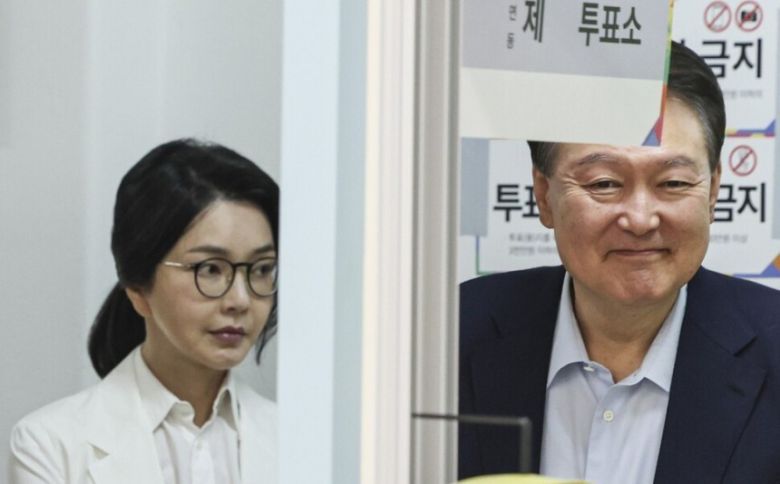 윤석열 전 대통령과 김건희 여사가 제21대 대통령 선거일인 지난 3일 서울 서초구 원명초등학교에 마련된 서초4동제3투표소에서 투표하기 위해 줄을 서고 있다. 공동취재사진 |