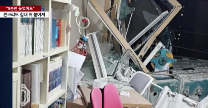 YTN에 따르면 주민 A씨가 공개한 사진엔 아이의 방 벽에 책장이 있었고, 그 옆으로 책상이 놓여 있었다. 그런데 천공기가 외벽에 부딪히며 유리창이 깨지고 부서진 벽체가 집 안으로 밀려 들어오면서 끊기고 휘어진 철근이 그대로 모습을 드러냈다. 또 콘크리트 덩어리가 쏟아지며 침대의 형태는 거의 보이지 않을 정도로 피해를 입었다.