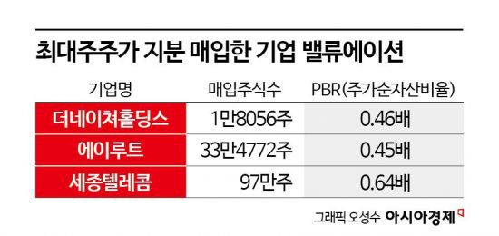 세종텔레콤도 최대주주가 지분을 확대한 후 주가가 상승했다. 지난달 28일 세종텔레콤은 최대주주 세종이 장내 매수로 97만주를 매수해 보유 비율을 58%로 끌어올렸다고 공시했다. 세종은 49억원 규모의 자기 자금도 투입했다. 이 공시 이후 세종텔레콤의 주가는 지난 5일까지 약 25% 상승했다.