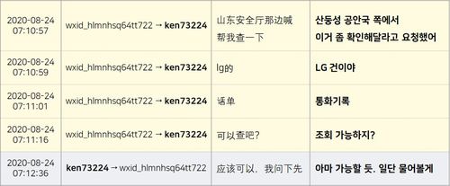 대화 상대방이 산둥성 공안국에서 'LG 건 통화기록' 조회를 요구한다고 하자 ken73224가 가능하다고 답한 내용 등이 담겼다.