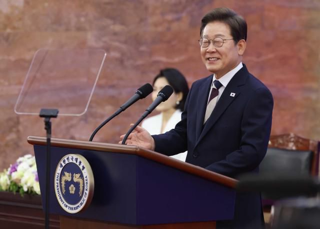 6月4日上午11时,李在明在首尔汝矣岛国会举行的第21届总统就职典礼上进行就职宣誓。 【图片来源 韩联社】