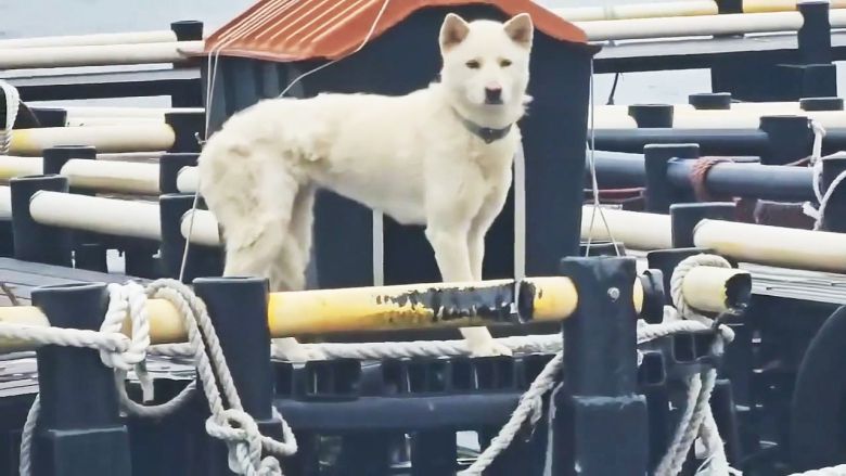 출렁거리는 바다 위, 덩그러니 놓인 개집 옆에서 백구 한 마리가 눈을 맞춥니다.