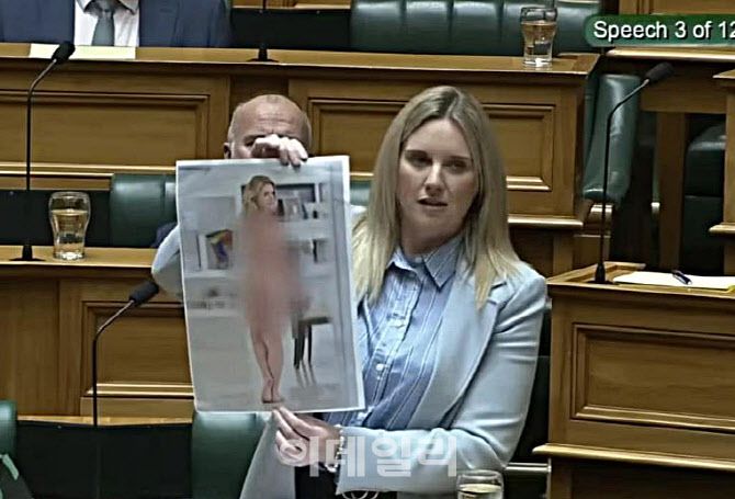9일 뉴질랜드헤럴드 등 현지 매체에 따르면 뉴질랜드 액트당 소속 로라 맥클루어 의원은 지난달 14일 의회에서 A3 용지에 인쇄된 자신의 나체 사진을 펼쳐 보였다.