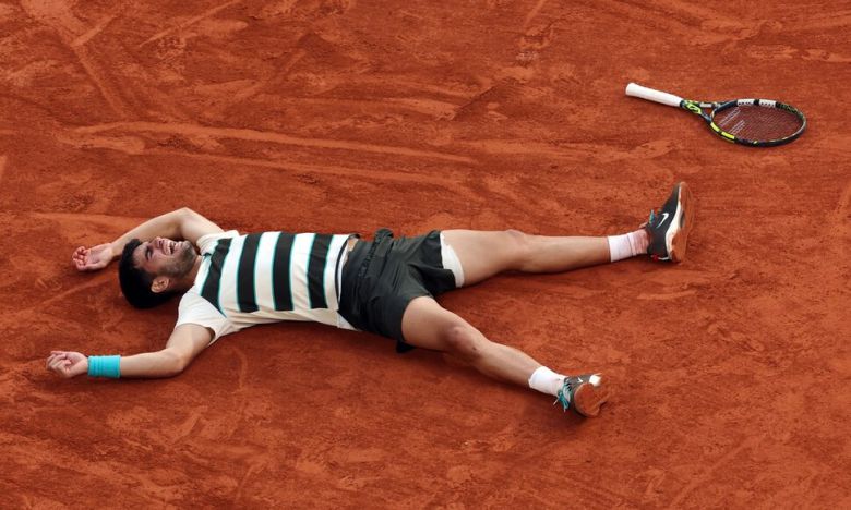 카를로스 알카라스(스페인)가 8일(현지시각) 프랑스 파리의 롤랑가로스에서 열린 프랑스오픈 테니스 남자단식 결승전에서 세계 1위 얀니크 신네르(이탈리아)를 5세트 접전 끝에 꺾은 뒤 클레이코트 위에 누워 있다. 파리/UPI 연합뉴스 |
