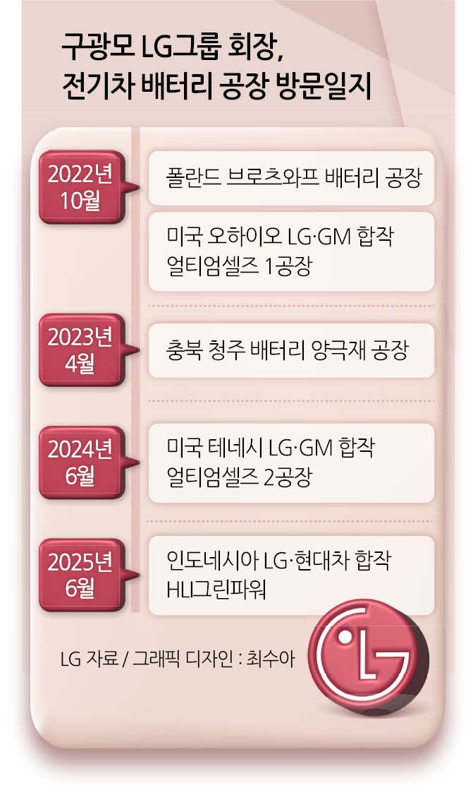 LG 관계자는 이번 구 회장의 행보에 대해 “전기차 캐즘이 예상보다 길어지고 있고, 중국 업체와의 경쟁이 치열해지는 상황이지만 이럴 때일수록 더욱 철저하게 포스트 캐즘을 준비하겠다는 구 회장의 의지가 반영된 것”이라고 전했다.