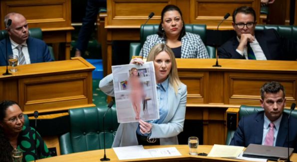 로라 맥클루어 의원이 지난달 뉴질랜드 의회에서 자신이 직접 만든 딥페이크 사진을 들어 보였다. 로라 맥클루어 인스타그램 캡처