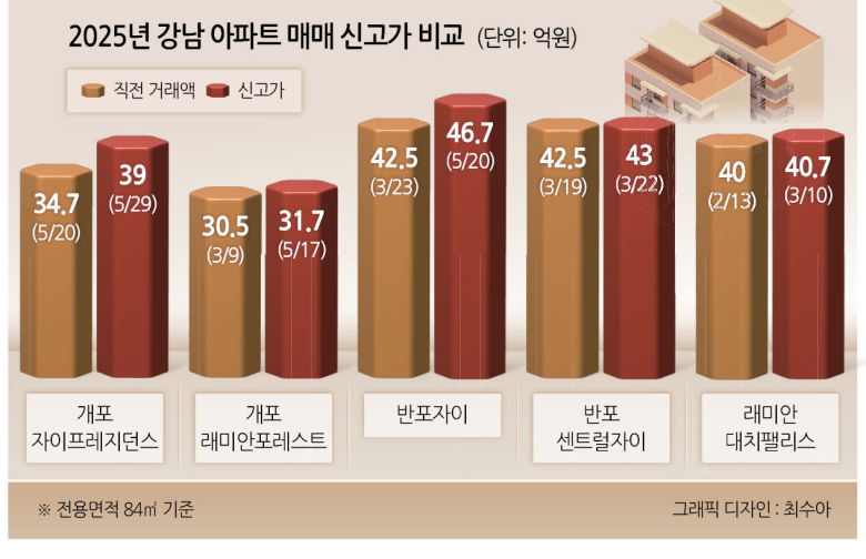 반포 구축 아파트인 ‘반포 자이’와 ‘반포 센트럴자이’의 경우 각각 지난달 46억7000만원과 43억원에 거래됐고, 대치동의 대장으로 꼽히는 ‘래미안대치팰리스’는 지난 3월 40억7000만원에 신고가 거래됐다. 이제 막 40억원을 돌파한 ‘개포자이프레지던스’도 이러한 상승세에 합류한 것으로 보인다.