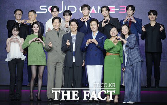 오징어 게임 시즌3 배우들이 9일 오전 서울 용산구 서울드래곤시티에서 열린 넷플릭스 새 시리즈 '오징어 게임' 시즌3 제작발표회에 참석해 포즈를 취하고 있다. /박헌우 기자 |