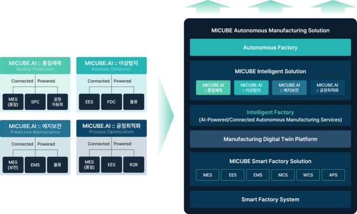 엠아이큐브솔루션은 이번 전시회를 통해 제조실행시스템(MES), 설비엔지니어링시스템(EES) 등 스마트팩토리 솔루션과 통합, 연계 운영할 수 있는 'MICUBE.AI' 솔루션 아키텍처를 방문객 누구나 쉽게 이해할 수 있도록 영상으로 소개할 계획이다.