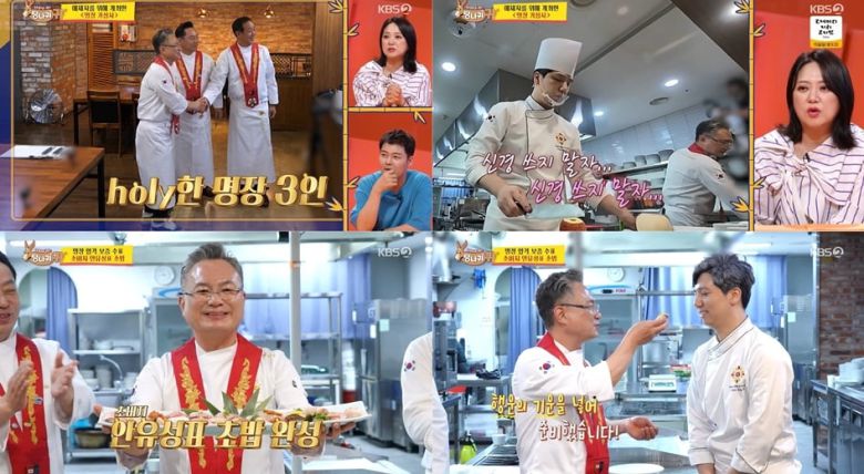 그러나 권정일 셰프는 칼에 손이 베이는 실수를 범했고, 떡갈비와 규아상을 선보였지만 최종 심사 결과 부적격 판정을 받아 아쉬움을 남겼다. 낙담하는 후배의 모습에 안유성은 명장 심사 당시 합격을 안긴 ‘안유성표 초밥’을 선보이며 후배의 행운을 빌었다.