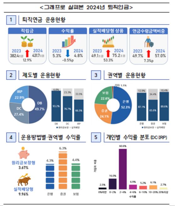 제도별 수익률은 DB 4.04%, DC 5.18%, IRP 5.86%로, 운용 주체가 회사가 아닌 개인이고 실적배당형 비중이 높은 제도일수록 상대적으로 수익률이 더 높았다.