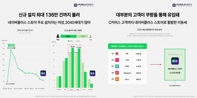 데이터 분석 플랫폼 아이지에이웍스 모바일인덱스는 지난 4월 경쟁 앱에서 네이버플러스 스토어로 유입된 사용자를 분석한 결과, 대부분의 고객이 쿠팡을 통해 유입됐다고 9일 밝혔다. 이에 따르면 경쟁 앱에서 유입된 총 243만4905명 중 약 80%인 194만명이 쿠팡을 통해 들어온 것으로 추정된다.