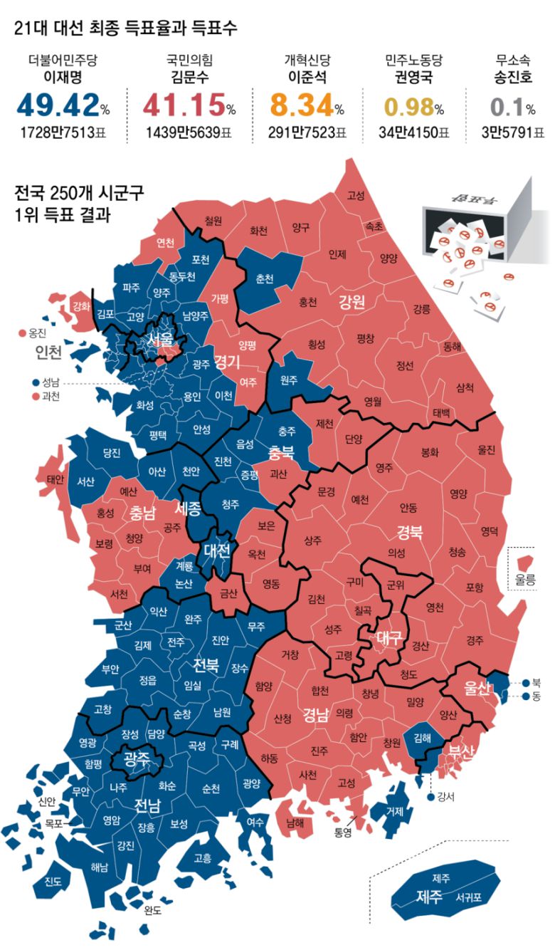 이번 대선에서 이 대통령은 광역자치단체 기준으로 강원과 TK(대구·경북), PK(부산·울산·경남) 지역에서 김 후보에 밀렸다. 지난 대선 때와 득표율을 비교하면 대구에선 1.6%포인트(20대 21.6%, 21대 23.2%), 강원에선 2.1%포인트(20대 41.7%, 21대 43.9%) 상승한 것으로 나타났다. 경북(1.7%포인트) 부산(2%포인트) 울산 (1.7%포인트) 경남(2%포인트) 등 다른 지역도 상승폭이 2% 안팎에 머물렀다.
