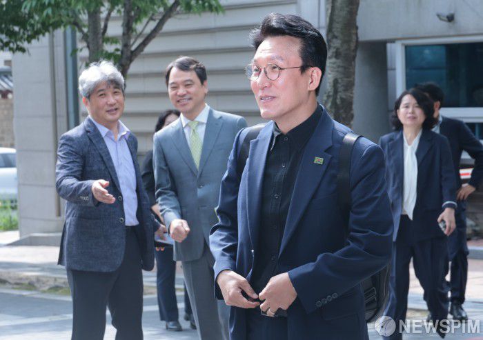 [서울=뉴스핌] 이길동 기자 = 김민석 국무총리 후보자가 9일 서울 종로구 통의동 금융감독원 연수원에 마련된 인사청문회 준비 사무실로 출근하며 취재진의 질문에 답하고있다. 2025.06.09 gdlee@newspim.com