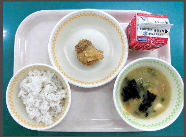 일본 엑스(X, 옛 트위터)에서 논란된 일본 후쿠오카시의 한 초등학교 대상의 급식. 후쿠오카시 학교급식공사 홈페이지에 따르면 해당 식단은 보리밥, 닭튀김 1개, 봄양배추 된장국, 우유였다. 9일 아사히신문에 따르면 최근 쌀 부족 등 일본 내 인플레이션 문제가 심각하면서 지자체에서도 학생들 급식비를 줄이기에 나섰다. [엑스] |