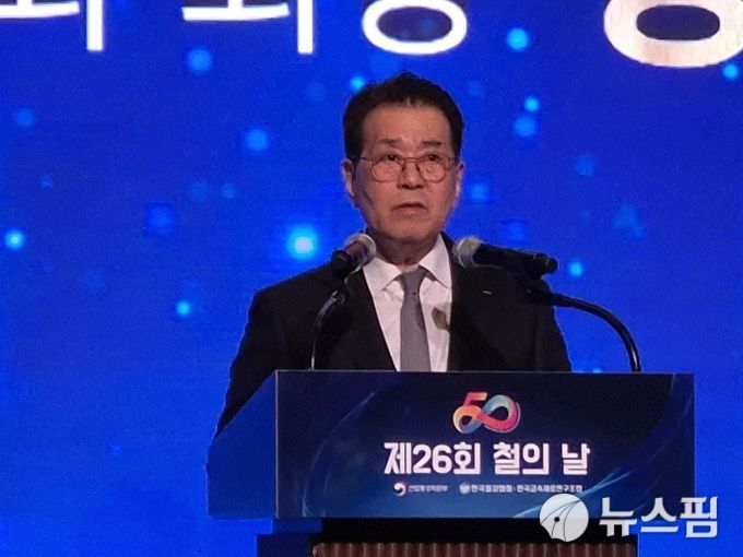 [서울=뉴스핌] 김승현 기자 = 장인화 한국철강협회장이 9일 제26회 철의 날 기념식에서 기념사를 하고 있다. 2025.06.09 kimsh@newspim.com |