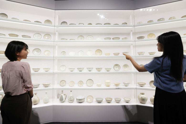 국립중앙박물관 용산 개관 20주년 기념 특별전 '새 나라 새 미술: 조선 전기 미술 대전'에서 관계자들이 도자기를 둘러보고 있다. 연합뉴스