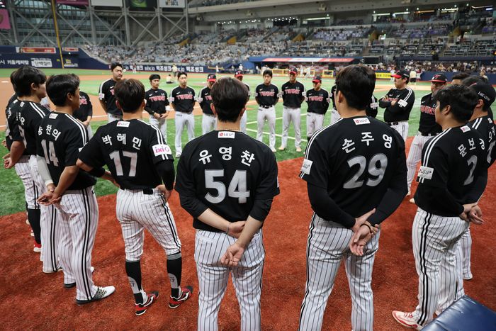 LG 선수들이 6일 고척스카이돔에서 열린 2025 KBO리그 키움전에 앞서 미팅을 진행하고 있다. 사진 | LG 트윈스