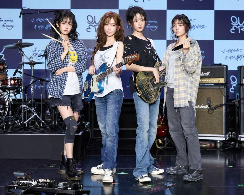 밴드 QWER이 9일 서울 서대문구 예스24 원더로크홀에서 열린 미니 3집 '난 네 편이야, 온 세상이 불협일지라도' 발매 기념 쇼케이스에서 포즈를 취하고 있다. 왼쪽부터 시계방향으로 히나, 시연, 쵸단, 마젠타. 타마고 프로덕션 제공.