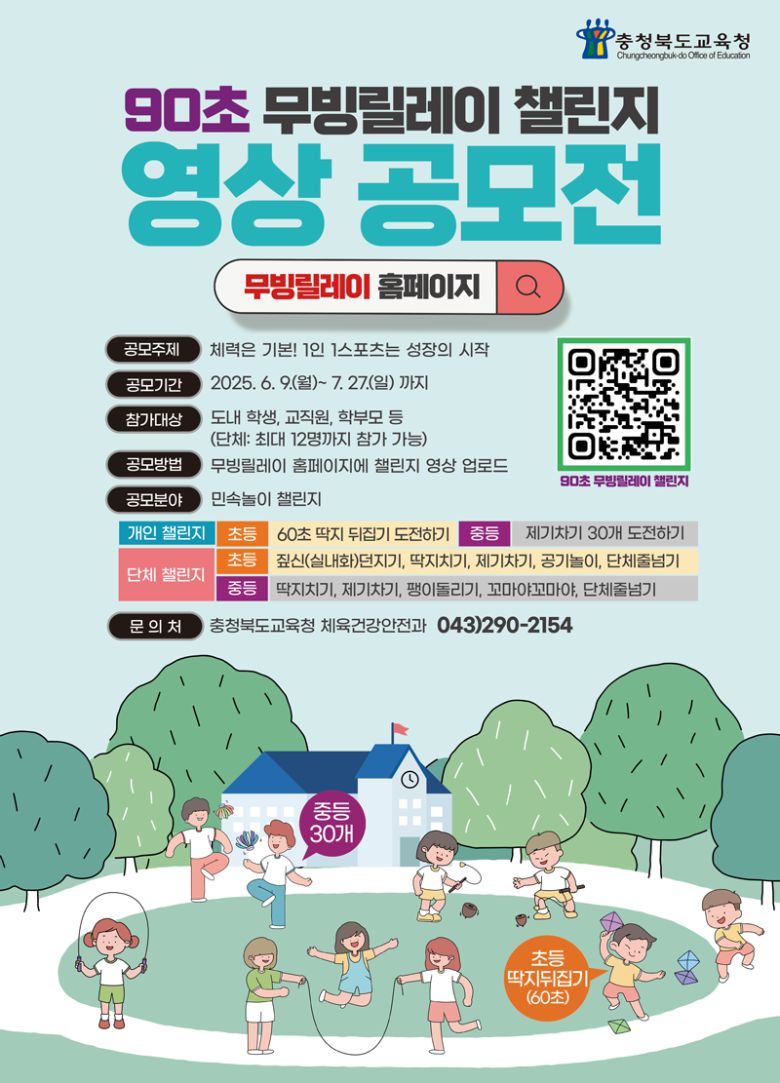 충북교육청은 학생, 교직원, 학부모 등 교육공동체가 참여하는 '충북형 몸활동 90초 무빙릴레이 챌린지' 영상 공모전을 진행한다고 9일 밝혔다.