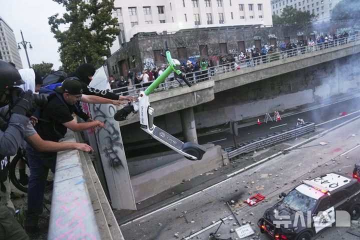 [로스앤젤레스=AP/뉴시스] 8일(현지 시간) 미 캘리포니아주 로스앤젤레스 도심 메트로폴리탄 구치소 인근 101번 고속도로 육교에서 이민세관단속국(ICE)의 불법 이민자 단속에 항의하는 시위대가 경찰차를 향해 스쿠터를 던지고 있다. 2025.06.09. |