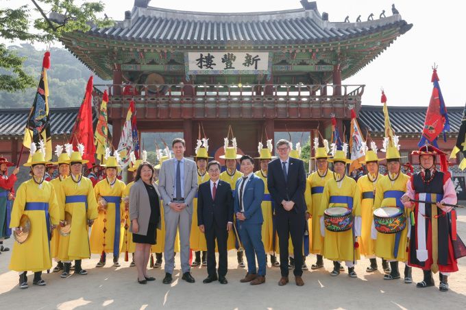 두 사람은 이날 조선 후기 개혁정치의 상징인 화성행궁을 찾아 정조대왕이 백성과 소통하며 지방통치를 실험했던 공간의 역사적 의미를 되새겼다. 이어 수원시립미술관에서 진행된 면담에서는 관세 파고 속 양 지역 간 경제협력 강화, 미래세대 교류 확대, 스포츠 외교 등 협력 의제를 논의했다.