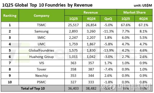 글로벌 파운드리 10개사의 2024년 4분기·2025년 1분기 매출과 점유율 추이./사진=트렌드포스