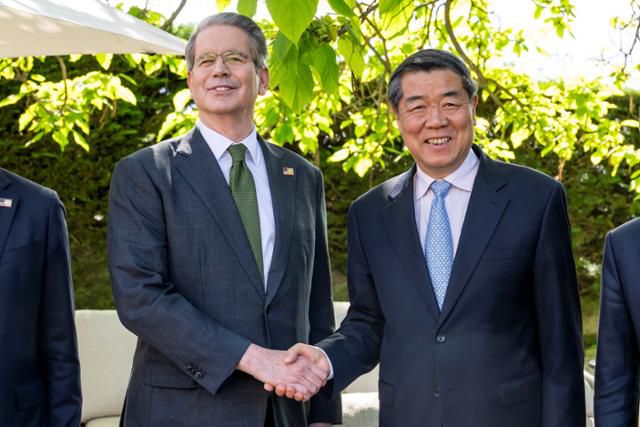 스콧 베선트(왼쪽) 미국 재무장관이 지난달 11일 스위스 제네바에서 열린 미중 고위급 무역 회담에서 허리펑 중국 부총리와 악수하고 있다. 제네바=로이터 연합뉴스