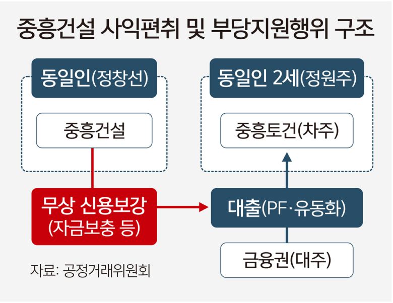 중흥건설은 2015년 7월부터 올해 2월까지 약 10년간 중흥토건 및 6개 계열사가 시행하고 중흥토건이 단독 시공하는 12개 부동산 개발 사업과 관련해 총 3조2096억원 규모의 신용보강을 무상으로 제공한 혐의를 받는다. 중흥그룹은 크게 총수인 정창선 회장이 최대주주로 있는 중흥건설과 정 회장의 아들인 정원주 부회장이 지분 100%를 소유한 중흥토건을 주력사로 두고 있다.