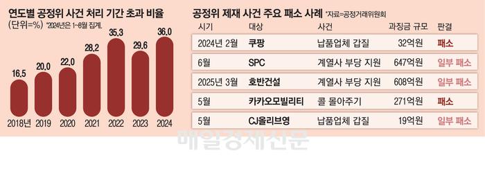 공정위 사건 처리도 지연됐다. 사건 처리 기간이 초과된 비율은 2018년 16.5%였으나, 2023년 29.6%, 지난해에는 8월 기준으로 36%까지 늘었다. 연간 3000건을 넘던 사건 처리 실적은 조직 개편 이후 2000건대로 줄었다.