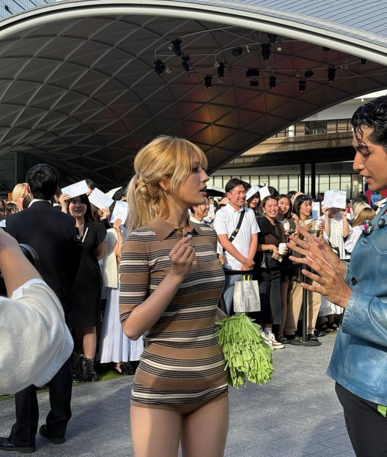 특히 베이지, 화이트, 다크 브라운이 조화를 이루는 스트라이프 패턴의 폴로넥 바디수트를 착용해 세련된 무드를 자아냈으며, 하의 실종을 연상케 하는 과감한 착장에도 자신감 넘치는 포즈로 현장 분위기를 압도했다.