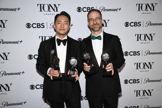 박천휴(왼쪽) 작가와 작곡가 윌 애런슨이 8일(현지시간) 미국 뉴욕 라디오시티 뮤직홀에서 열린 제78회 토니상 시상식에서 창작 뮤지컬 '어쩌면 해피 엔딩'(Maybe Happy Ending)으로 최우수 오리지널 작사·작곡상(Best Orginal Score)과 최우수 극본상을 받은 후 기념 촬영하고 있다. 뉴욕=AP 뉴시스 |