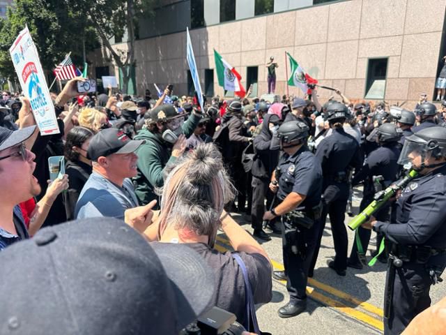그에 비하면 이날 오전 대치 상황은 심각하지 않아 보였다. 시위대는 "ICE는 LA에서 나가라" "그들(억류된 이민자들)을 석방하라" "부끄러운 줄 알아라" 등을 반복해서 외쳤지만 무력 충돌은 없었다. "당신들도 덥죠? 방패를 내려놓고 가족에게 돌아가세요. 불법에 저항하는 것이니 탈영이 아니에요." 군인들을 향한 한 시위자의 외침에 폭소가 터지기도 했다.