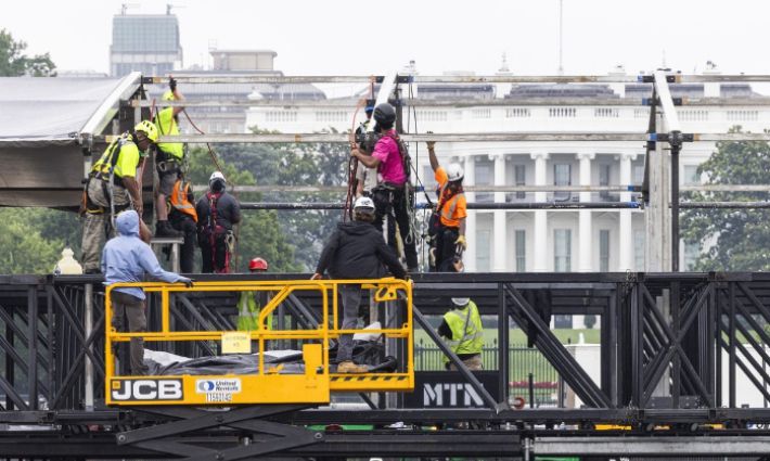 지난 8일(현지시간) 미국 워싱턴DC 백악관 인근에서 도널드 트럼프 대통령이 열병식을 관람할 무대를 설치하고 있다. 연합뉴스 |