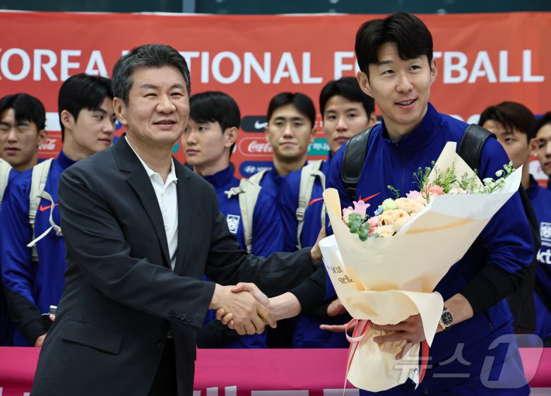 11회 연속 본선 진출을 축하받는 손흥민(오른쪽)2025.6.6/뉴스1 ⓒ News1 김도우 기자