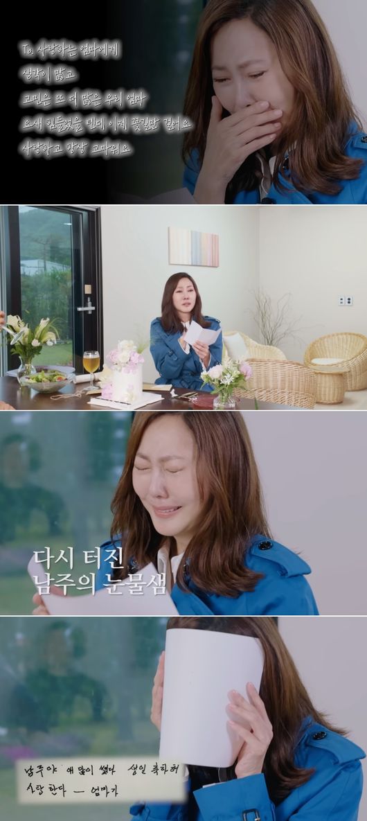 제작진은 "어머님이 뜨개질 하다가 써주셨다"라고 밝혔고, 김남주는 간신히 눈물을 멈추며 "민망하다"라며 웃었다.