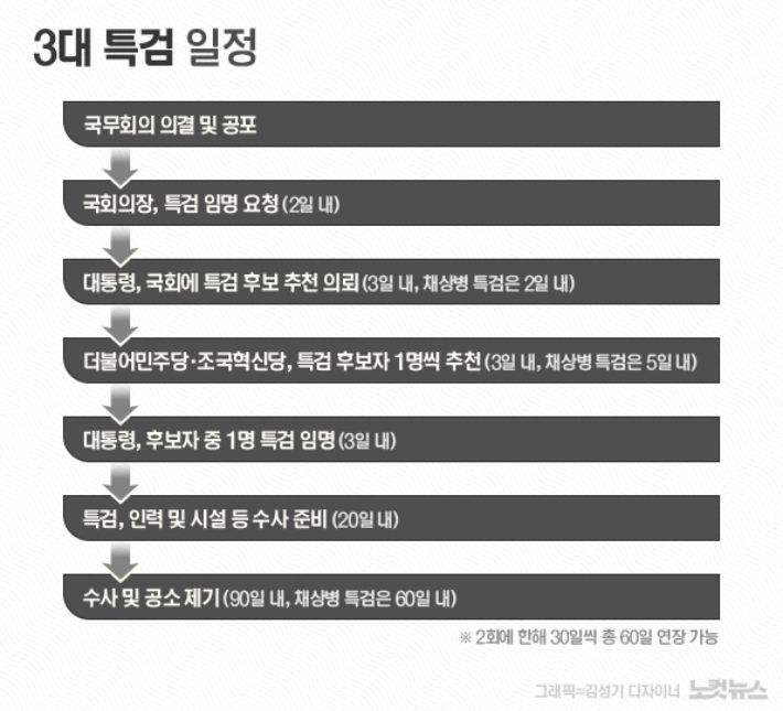 이 경우 내란 특검과 김건희 특검은 11일 이내에, 채상병 특검은 12일 이내에 특검을 임명해야 한다. 이에 따라 오는 주말 안에 각 특검 후보군 윤곽이 드러날 수도 있는 상황이다. 국정농단 특검의 경우 국회 통과 후 13일 만에 박영수 특검이 임명됐다. 특검 임명부터 수사 준비를 거치면, 이르면 이달 말에서 내달 초 특검 수사가 막을 올릴 것으로 보인다.