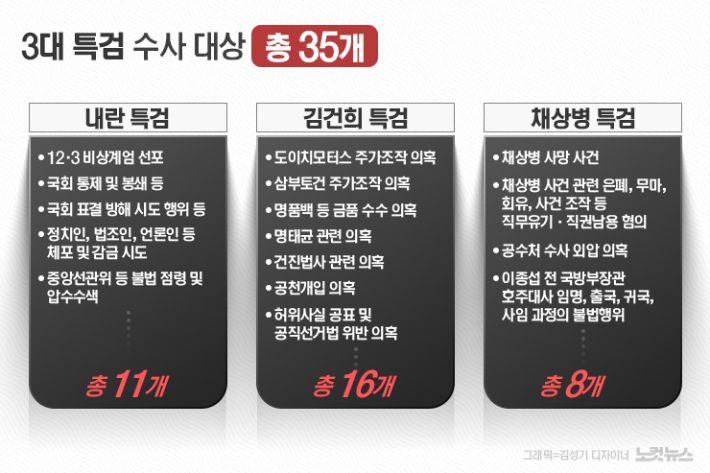 내란 특검은 △12·3 비상계엄 선포 △국회 통제 및 봉쇄 △국회 표결 방해 시도 행위 등 총 11개, 김건희 특검은 △도이치모터스 주가조작 의혹 △삼부토건 주가조작 의혹 △명품백 등 금품 수수 의혹 △명태균 관련 의혹 △건진법사 관련 의혹 등 총 16개다.