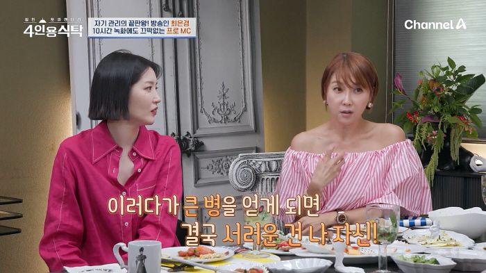 최은경은 9일 방송한 채널A '절친 토큐멘터리-4인용식탁'에 호스트로 출연했다. 이날 최은경은 한의사 이경제, 김영희, 김새롬을 게스트로 초대했다.