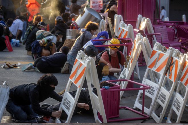 이민세관단속국(ICE)의 대대적인 불법 이민자 단속에 항의하는 시위대가 8일(현지시간) 캘리포니아주 로스앤젤레스(LA)에서 경찰이 발사한 저살상용인 고무탄 등에 대응해 거리에 놓인 공원 의자와 도로 표지판 뒤에 몸을 숨기고 있다./로이터·연합 |