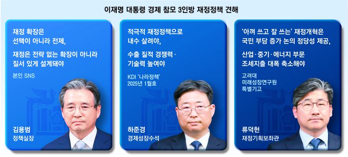 새 정부 첫 추가경정예산 편성을 앞두고 이재명 대통령이 지난주 임명한 김용범 정책실장, 하준경 경제성장수석, 류덕현 재정기획보좌관 경제정책 참모 3인방의 재정운용 철학에 관심이 모아진다.
