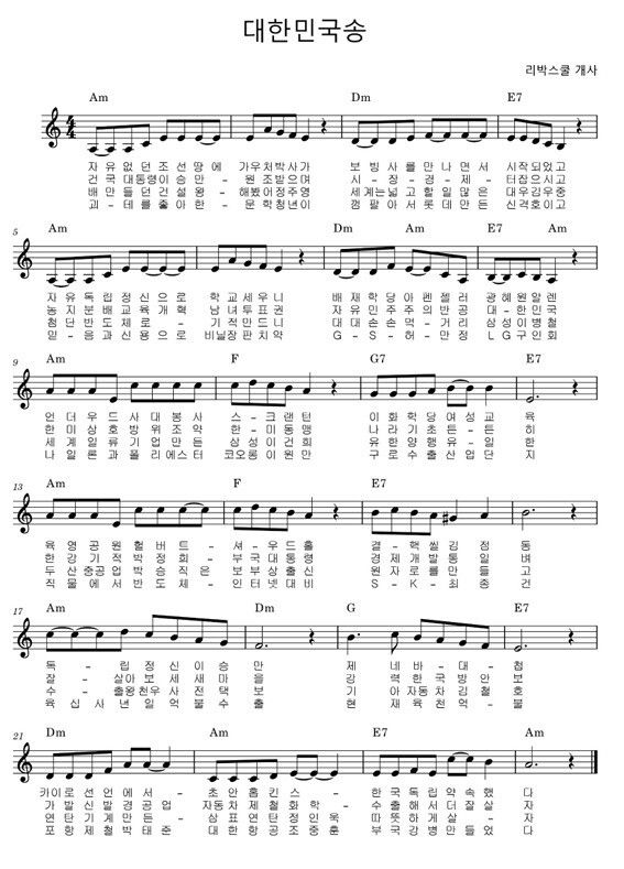 손효숙 리박스쿨 대표가 ㈔역사연구원의 7차 세미나에서 소개한 ‘대한민국송’ 악보. 세미나 자료 갈무리 |