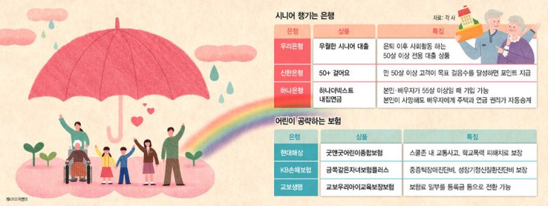 은행권에서는 영업점을 통폐합하는 추세지만, 시니어 특화 영업점은 신경 써서 관리하고 있다. 하나은행의 ‘하나더넥스트라운지’나 우리은행의 ‘시니어플러스’ 등이 있다. 일반 영업점보다 카운터가 낮고, 메뉴도 큰 글씨로 적혀 있다. 쉬다 갈 수 있는 공간도 배치했다. 은퇴 후 자산설계 등을 맞춤 상담받을 수 있다. 케이비(KB)국민은행은 어르신들이 많이 찾는 복지관에 대형 밴 차량이 찾아가 은행 업무를 처리해 주는 ‘시니어라운지’를 운영한다.