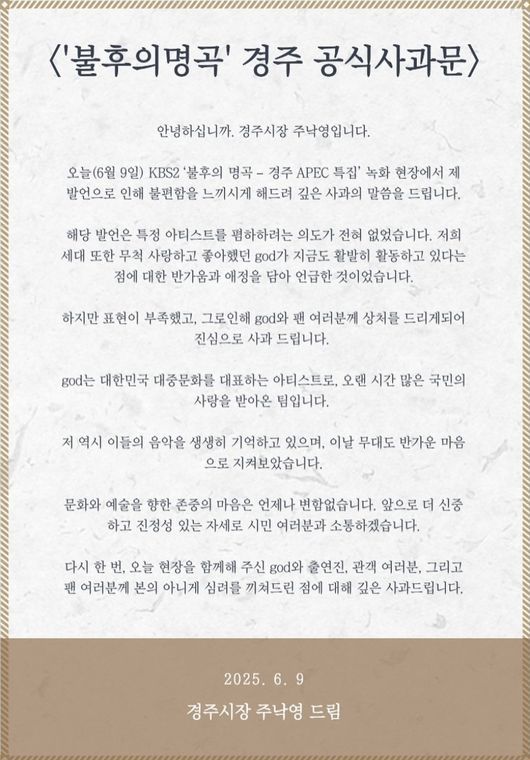 결국 주낙영 시장은 SNS를 통해 사과문을 발표했다. 그는 "해당 발언은 특정 아티스트를 폄하하려는 의도가 전혀 없었다. 저희 세대 또한 무척 사랑하고 좋아했던 g.o.d가 지금도 활발히 활동하고 있다는 점에 대한 반가움과애정을 담아 언급한 것이었다"라고 주장했다.
