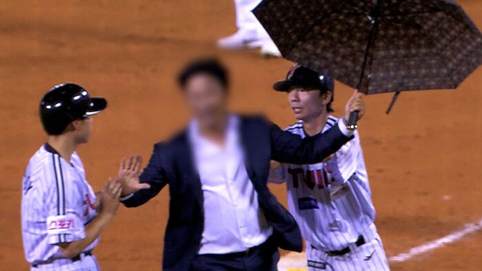 지난해 7월, 두산과 LG의 경기가 한창이던 서울 잠실야구장에 양복을 입은 한 남성이 이렇게 우산을 펼친 채 우측 외야 쪽에서 등장했습니다.