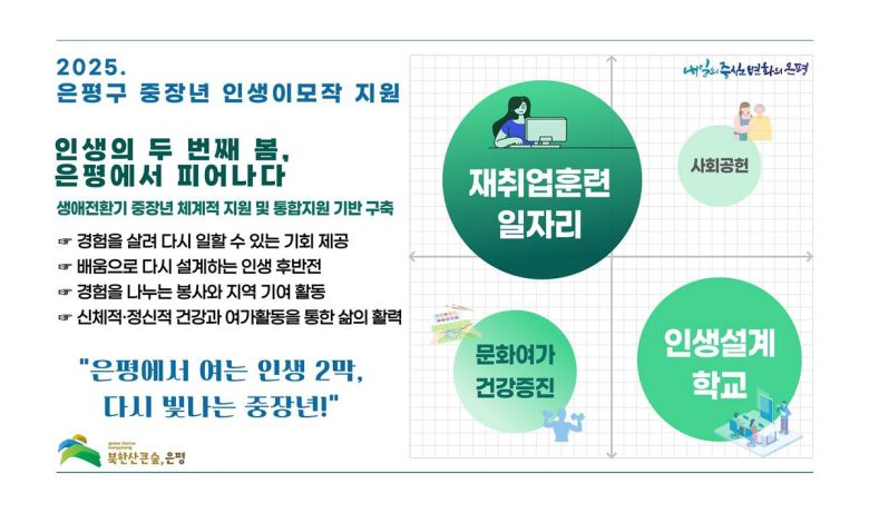 ‘은평에서 여는 인생 2막, 다시 빛나는 중장년!’이라는 비전 아래 구는 ▲취업훈련 및 일자리 연계 ▲배움을 통한 인생 후반기 재설계 ▲사회공헌 활동 기회 제공 ▲문화·여가·건강증진 프로그램 운영 등 4대 추진책을 중심으로 정책을 추진할 계획이다.