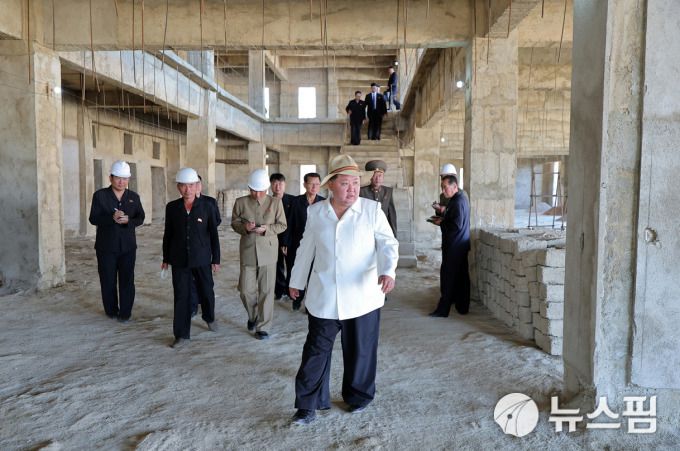 [서울=뉴스핌] 이영종 통일전문기자 = 김정은 북한 국무위원장이 9일 평북 평성시의 병원 건설장을 찾아 현장을 둘러보고 있다. 노출된 콘크리트 구조물과 철근 등을 통해 열악한 북한 건설의 실태를 엿볼 수 있다. [사진=노동신문] 2025.06.10 yjlee@newspim.com