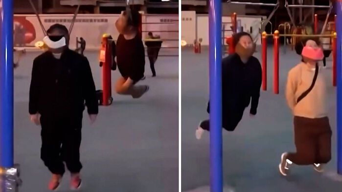 목 걸친 채 왔다갔다…단체로 철봉에 매달린 사람들, 왜