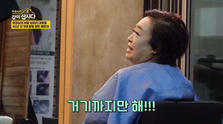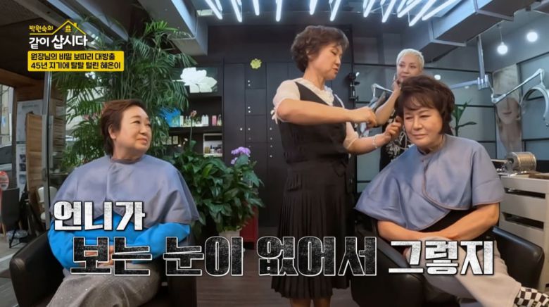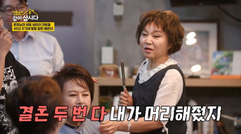 홍진희는 얼마 전 재방송으로 혜은이 딸 결혼식을 봤다고. 홍진희는 "여기서 다 머리하신 거냐"라고 물었다. 혜은이는 기억이 가물가물한지 "나 여기서 하지 않았나"라고 했다. 이에 원장은 "언니 결혼하냐"라고 놀렸다. 그러면서 "결혼 2번 다 내가 해줬다. (1번이 아니라) 2번이라 헷갈린다"라고 결혼식 비하인드를 전했다. 혜은이는 "우리 딸 보낼 때도 여기서 했다"라며 웃음을 터트렸다.