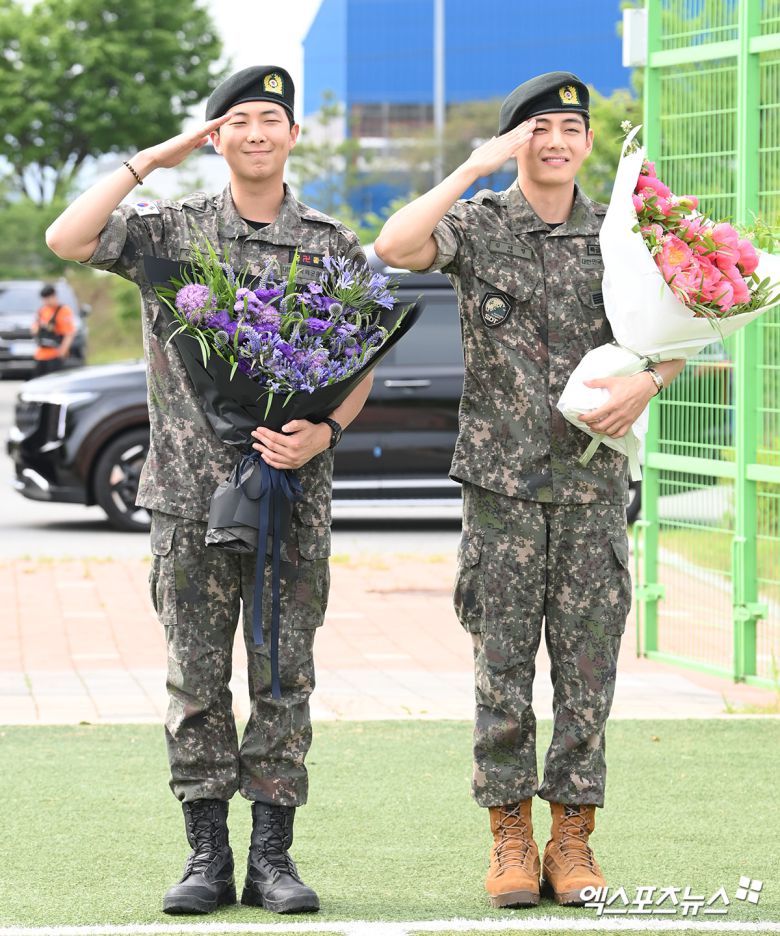 지난 2023년 12월 입대한 RM과 뷔는 이날 각각 강원도 화천과 춘천에서 전역했다. RM은 육군 제15보병사단 군악대, 뷔는 육군 제2군단 군사경찰 특수임무대에서 복무해왔다.
